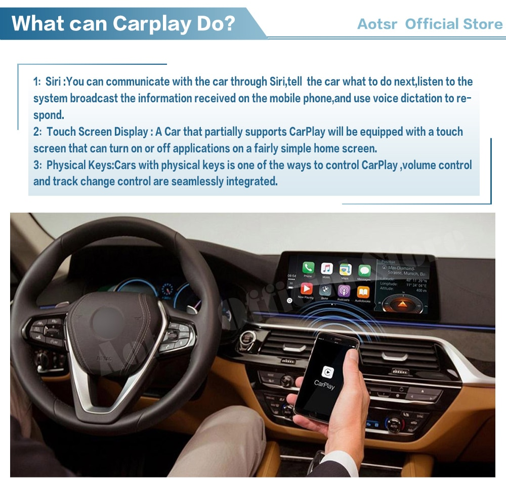 What can carplay do 1:Siri :You can communicate with the car through Siri,tell the car what to do next,listen to the system broadcast the information received on the mobile phone,and use voice dictation to respond. 2:Touch Screen Display : A Car that partially supports CarPlay will be equipped with a touch screen that can turn on or off applications on a fairly simple home screen. 3:Physical Keys:Cars with physical keys is one of the ways to control CarPlay ,volume control and track change control are seamlessly integrated.