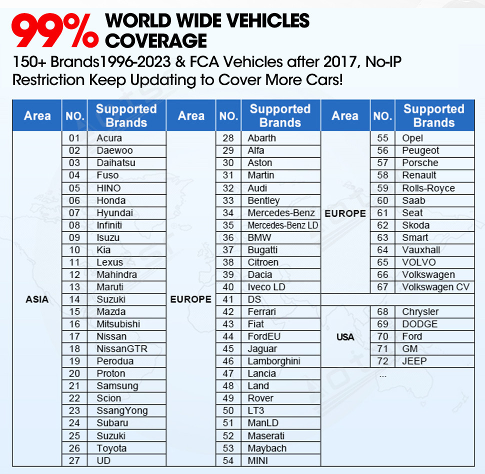 - Europe: compatible with VW, Audi, Volvo, Fiat, Porsche, Renault, Benz, BWM, Saab, Scion, Subaru, Abarth, Acura, Alfa, Bentley, Bugatti, Citroen, Dacia, Daewoo, EU Ford, Jaguar, Lancia, LandRover, Mini, Opel, Peugeot, Seat, Skoda, Smart, Sprinter, Vauxhall