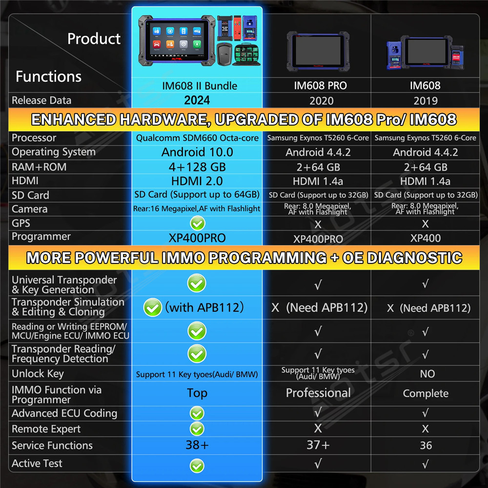 1.Improved Hardware Configuration: Updating from IM508/IM608/IM608 PRO, 2023 Autel IM608 II PRO key programmer improves 5x faster diagnostic speed, expands its memory from 64GB to 128GB, updates its operating system from Android 4.4.4 to Android 10.0, enhances its processor from 4-core to 8-core, etc.