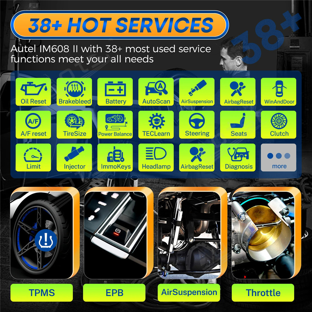 38+Service Functions for various scheduled service and maintenance performances including : Oil Reset, EPB, TPMS, BMS, Brake Bleed, DPF, Immo Keys, Injector, SAS, Suspension, Throttle, WIN DR ROOF, Seats, Lang Change, Headlamp, CHG Tire Size, TEC Learn, ABS/SRS, Cylinder, Turbocharging, Limit, Clutch, Trans Adaption, Airbag Reset.