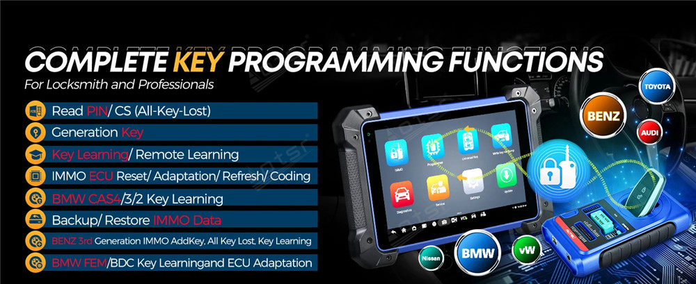 The XP400 Pro has been extended IMMO functionalities on BMW, BENZ and Audi etc., designed to work with IM508, IM608, IM608 Pro to perform various IMMO Key Pro/grammings, key chip Pro/gramming functions, MCU writing and reading,etc. Auto Detect Make, Model, Year, System. Read PIN (All Key Lost), Key Learning, IMMO ECU Reset/Adaption, IMMO ECU Refresh/Coding, Remote Learning