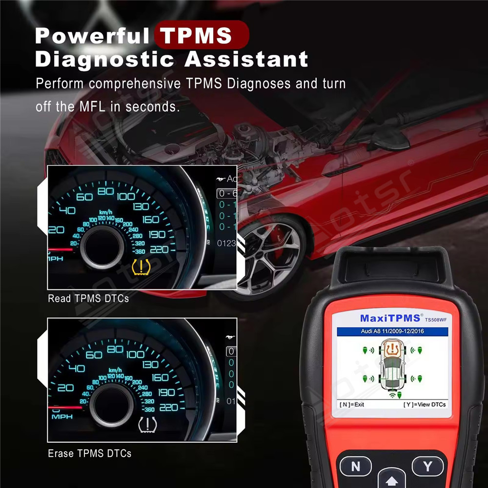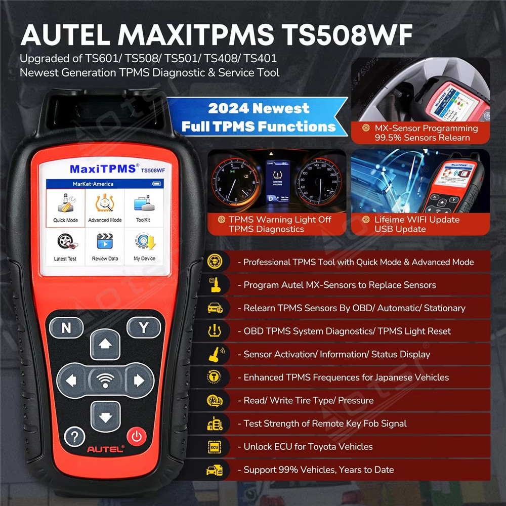 Autel MaxiTPMS TS508 is a new generation TPMS diagnostic & service tool specially designed to activate all known TPMS sensors, read TPMS sensor status, check TPMS system health condition, program MX-sensors and conduct TPMS relearn. With Quick Mode and Advanced Mode options, you can save time and energy by choosing the most suitable way to complete TPMS work. TS508K, the starting TPMS kit with one tool and 8 sensors, can be your right choice to experience AUTEL TPMS lines.