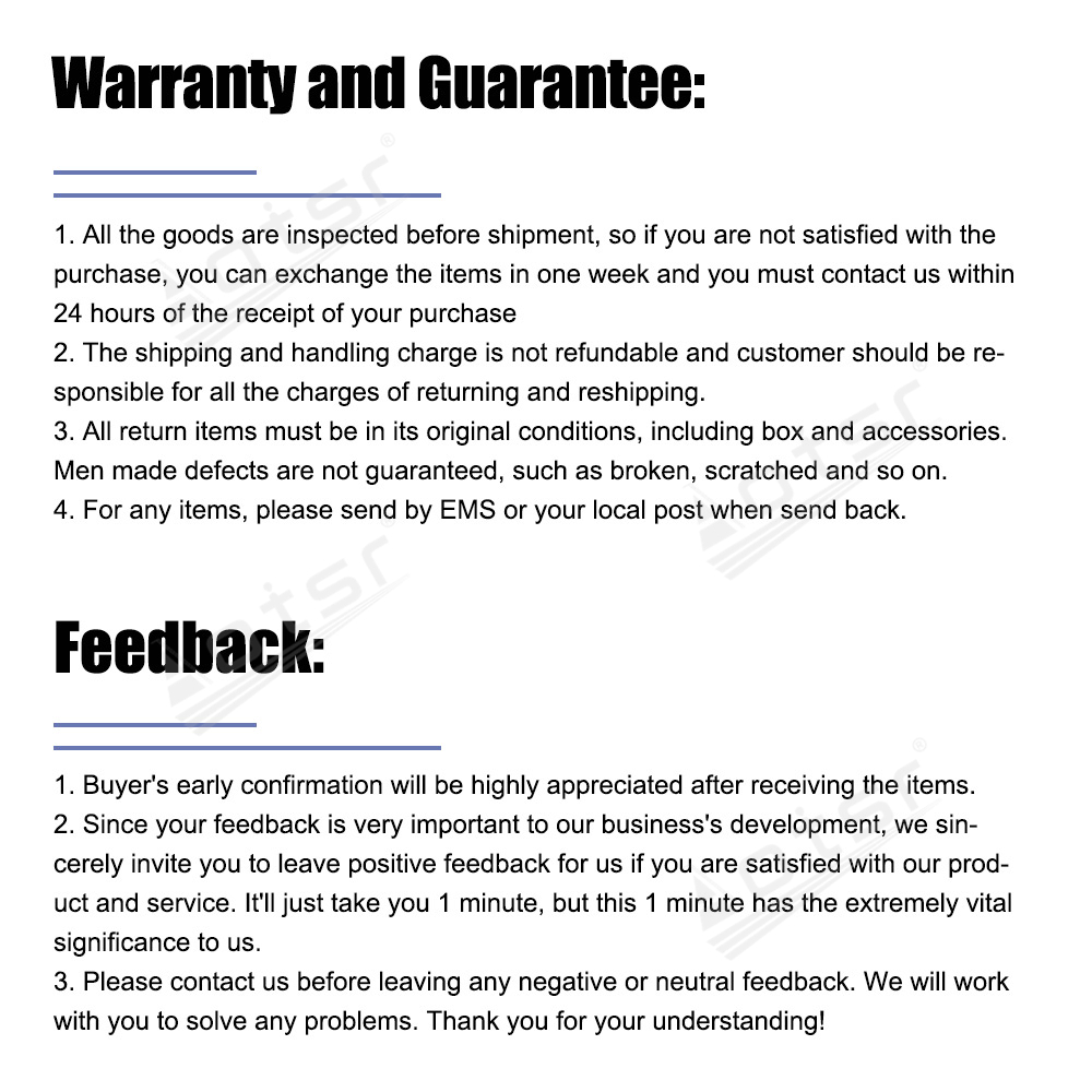 1.What features does the Android radio offer? The Android radio is an Android tablet that includes the ability to install Android apps and GPS navigation with the navigation app of your choice. Other features include the ability to connect MirrorLink with iPhone or Android phones, Wi-Fi connectivity, Bluetooth music and phone calls, AM/FM radio, etc, while most OEM features are retained. Additional accessories such as Bluetooth adapter, digital TV tuner, USB DVD player, aftermarket backup camera, etc. 2.About Installation Instruction Mostly, Android radios are plug and play, and usually there are wires diagram available showing how to connect in cars, so most of time people can install the radios by themselves. We can also provide live assistance online upon request. However, if you are afraid of breaking anything in your car, it's better to pay a professional to do the installation. 3.Do I need to pay custom duties? The price does not include tax, customs, or fees charged by the government. The buyer is responsible for those charges if applicable. If do not agree to pay for them, please do not buy. 4.What Android apps can be installed? Almost any Android apps compatible with the Android firmware version of the radio can be installed. Google Play is included on the radio. You can also install apps not in PlayStore by enabling 'Unknown sources'. 5.How can I connect the radio to the Internet? The Android radios have Wi-Fi connectivity, so they can be connected to any Wi-Fi network if you know the password. To connect to the Internet away from your home, you can either turn on your phone's Wi-Fi Hotspot or buy a dedicated Mobile Wi-Fi Hotspot for your car. Some Android radios also have built-in SIM slot that will let you use a SIM card to get 3G or 4G LTE connectivity.