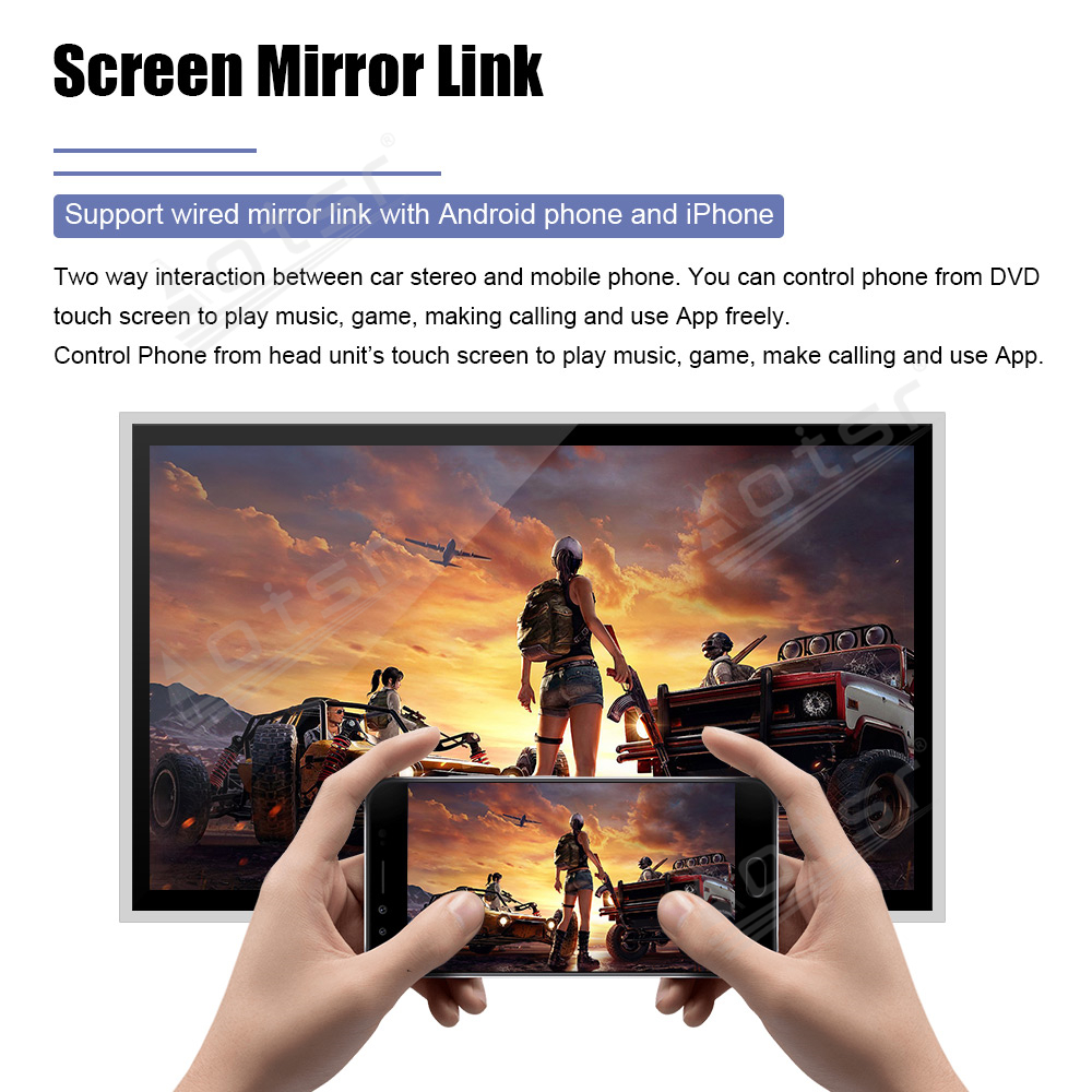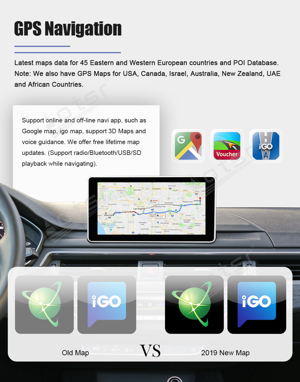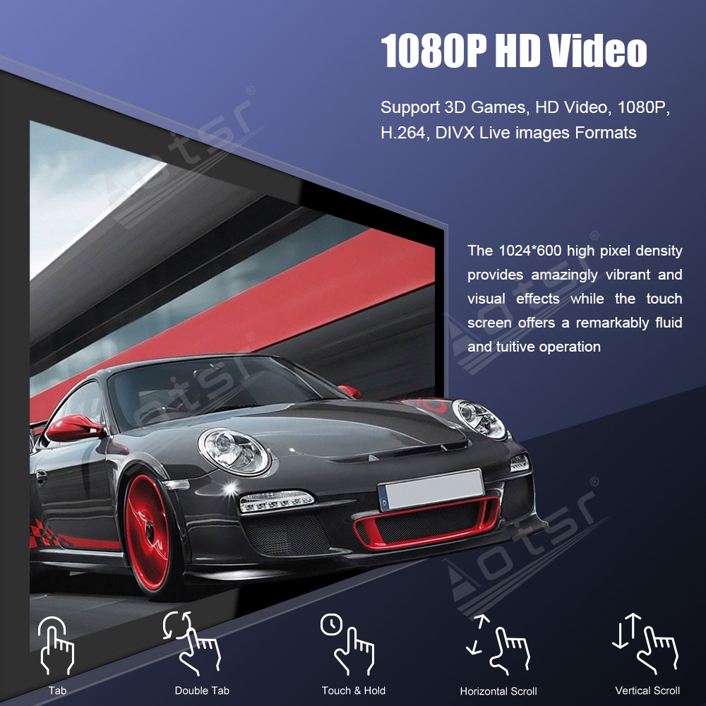 1:Resolution HD 1024*600 IPS Screen 2:Support voice control :English 3:Capacitive Multi-touch screen 4:Bluetooth 5.0 - Support three-way calling 5:Built-in Wifi /support 3G/4G hotpot Network 6:Support Android App download and Google play store 7:GPS navigation: Pre-installed offline maps of customer areas 8:Video support: WMV (VC1 code) AVI (H.264, MPEG4, Xvid, WMV), MP4 (H.263, H.264, MPEG4), MPG (MPEG-2), M4V (H.264, MPEG4) 9:Bluetooth 4.0 supports all brands of mobile phones, phone book input, music playback, support for A-Z name search